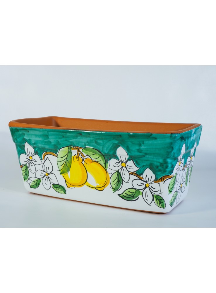 Cassetta rettangolare porta fiori in ceramica dipinta a mano con il disegno di fiori e limoni.
