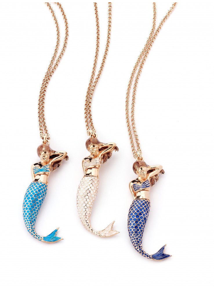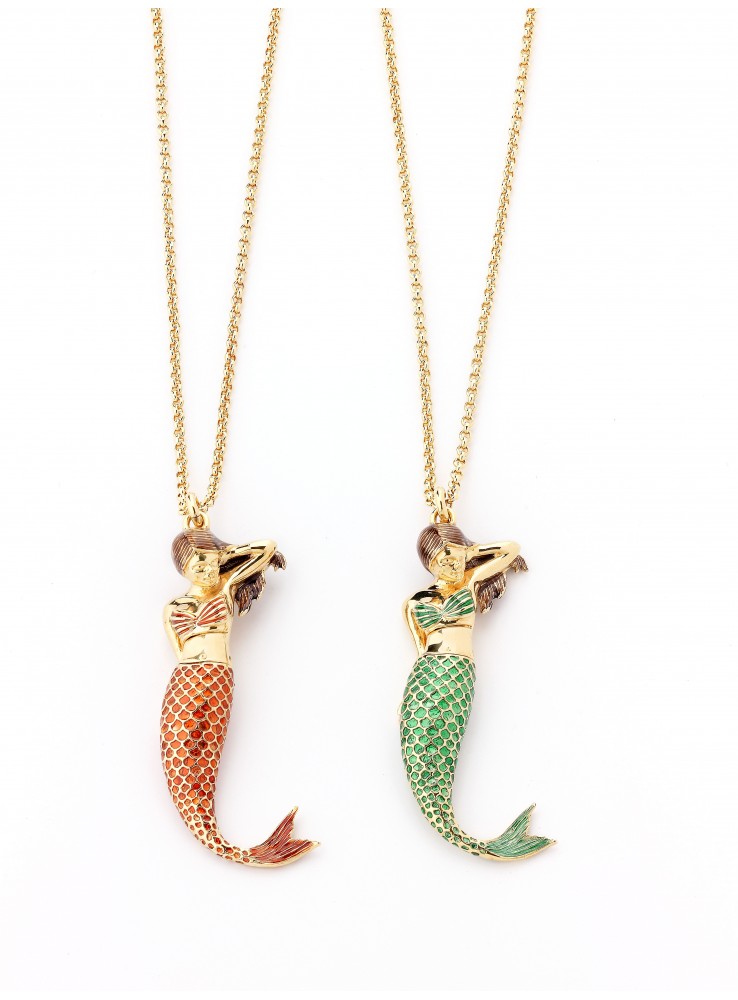 Corpetto e coda per ciondolo sirena in bronzo placcati oro e smaltati in diversi colori. Affinché il prodotto conservi l’integrità iniziale non deve essere messo a contatto con creme, profumi, saponi e acqua di mare.