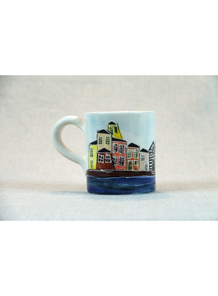 Ceramica policroma che rappresenta i tipici borghi liguri con le casette colorate, affacciati sul mare e le caratteristiche chiese bianche e nere. Pezzo unico.