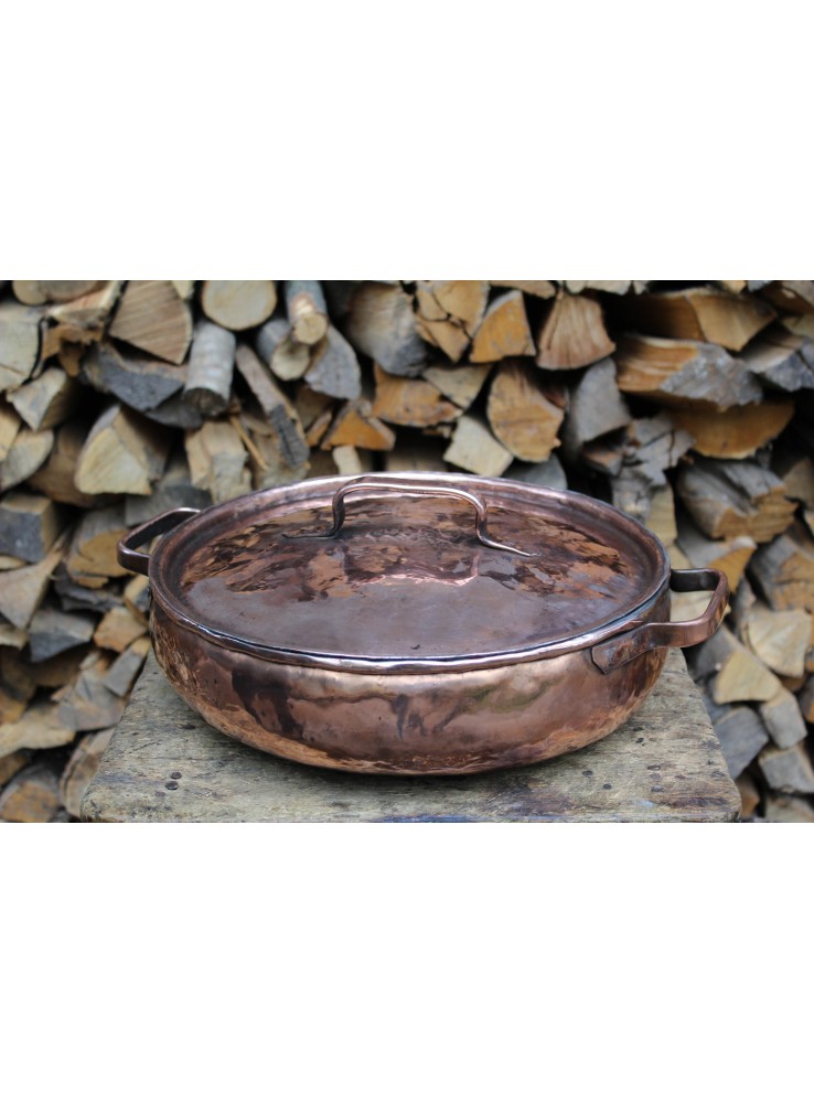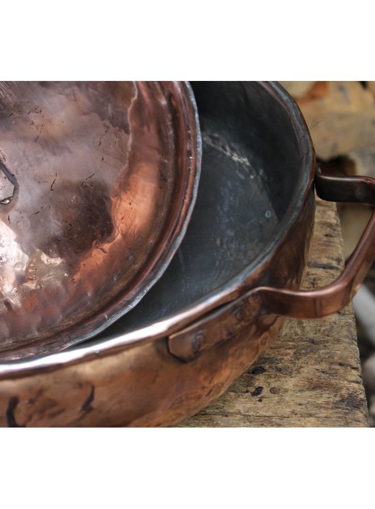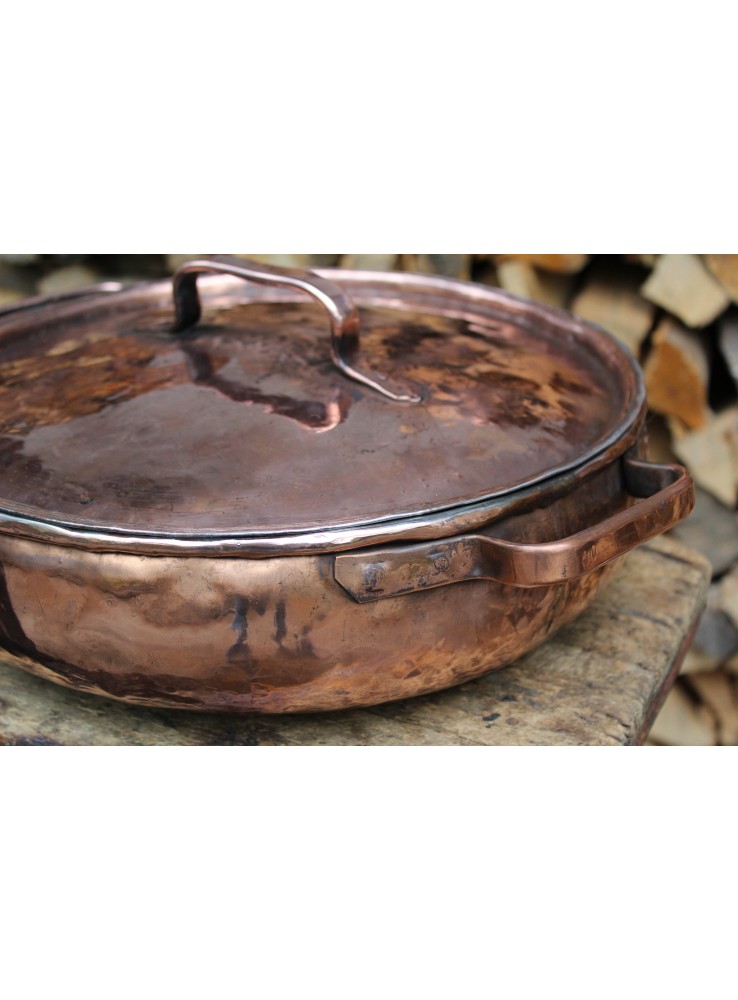 Pentola rotonda in rame lavorata a mano. Questo articolo per la cucina è realizzato totalmente a mano seguendo antiche arti di lavorazione del rame come lo sbalzo e la stagnatura. Finemente lavorata e martellata, partendo da una semplice lastra, viene stagnata internamente con cura a mano utilizzando stagno puro, questo permette l’uso sicuro in cucina. Grazie alla sua ottima conduzione del calore, le pentole in rame, sono Ideali per cucinare i nostri piatti e perfetta per preparare ottimi risotti. I tre manici sono anch’essi fatti a mano in rame pieno e realizzati per fornire la massima solidità e durata nel tempo. Se sei alla ricerca di veri oggetti unici di artigianato made in Italy fatti a mano, questo articolo può sicuramente fare al caso tuo.