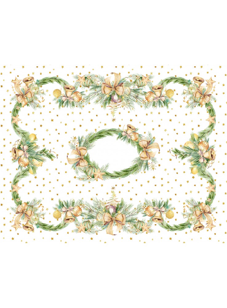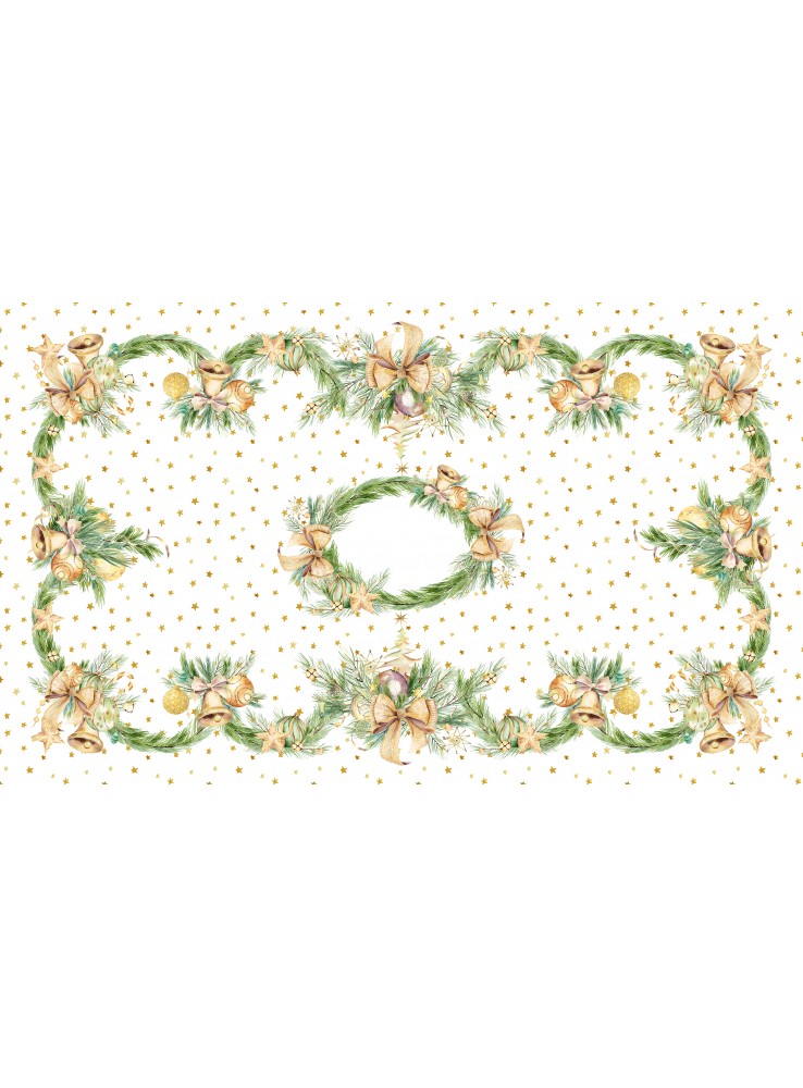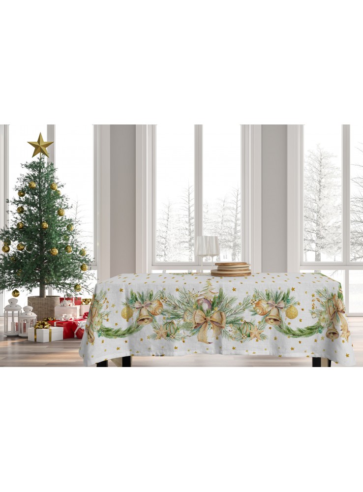 Tovaglia tema Natale in cotone panama con stampa digitale di campane dorate. Disponibile in due misure da 6 e da 12.