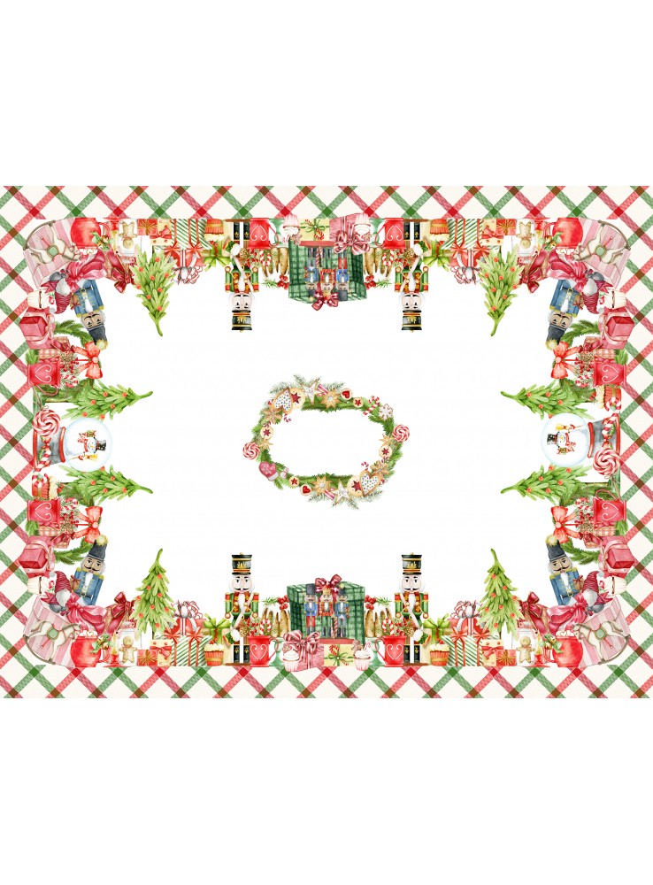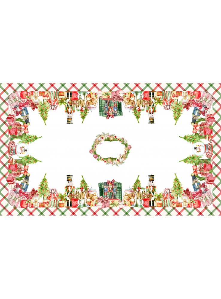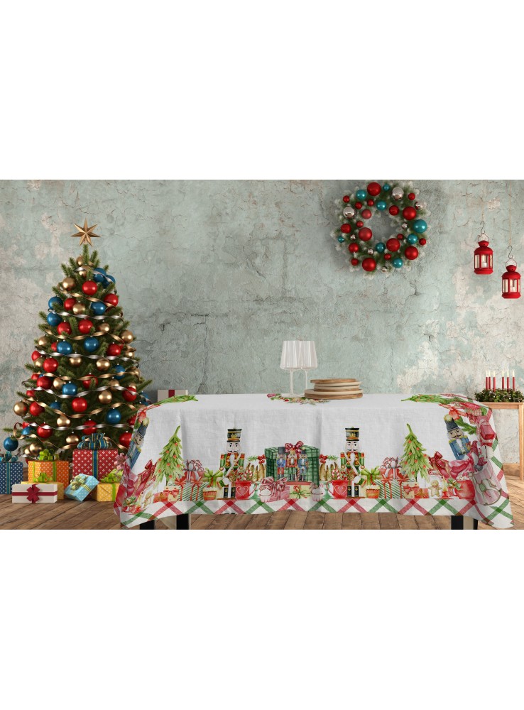 Tovaglia tema Natale in cotone panama con stampa digitale di pacchi regalo. Disponibile in due misure da 6 e da 12.