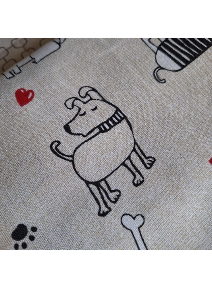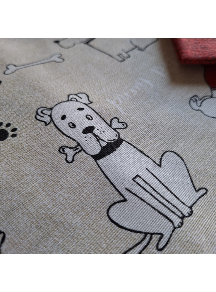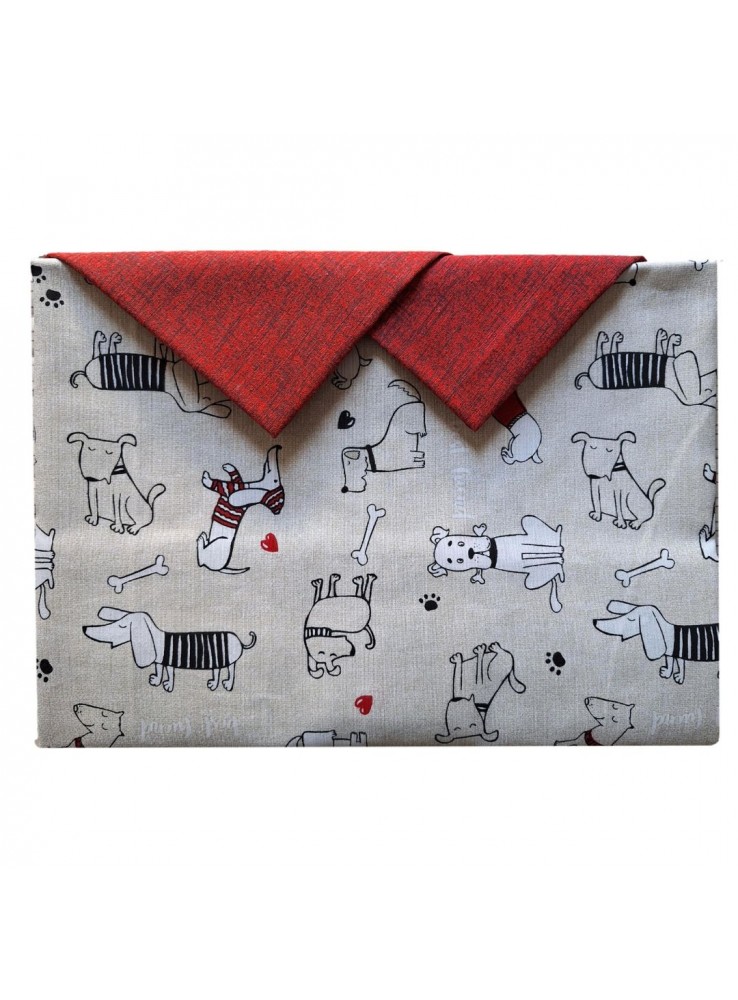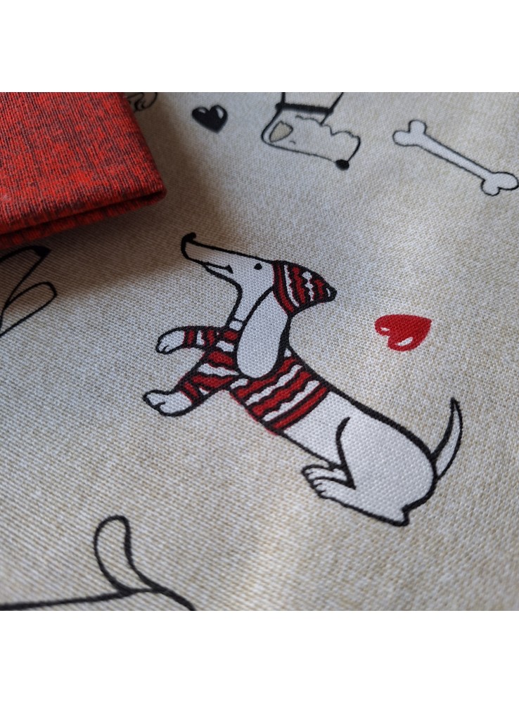 Tovaglia in cotone e poliestere della linea Venere con simpatica fantasia di cagnolini. Disponibile in tre dimensioni: piccola con 6 tovaglioli, media con 8 tovaglioli, grande con 12 tovaglioli