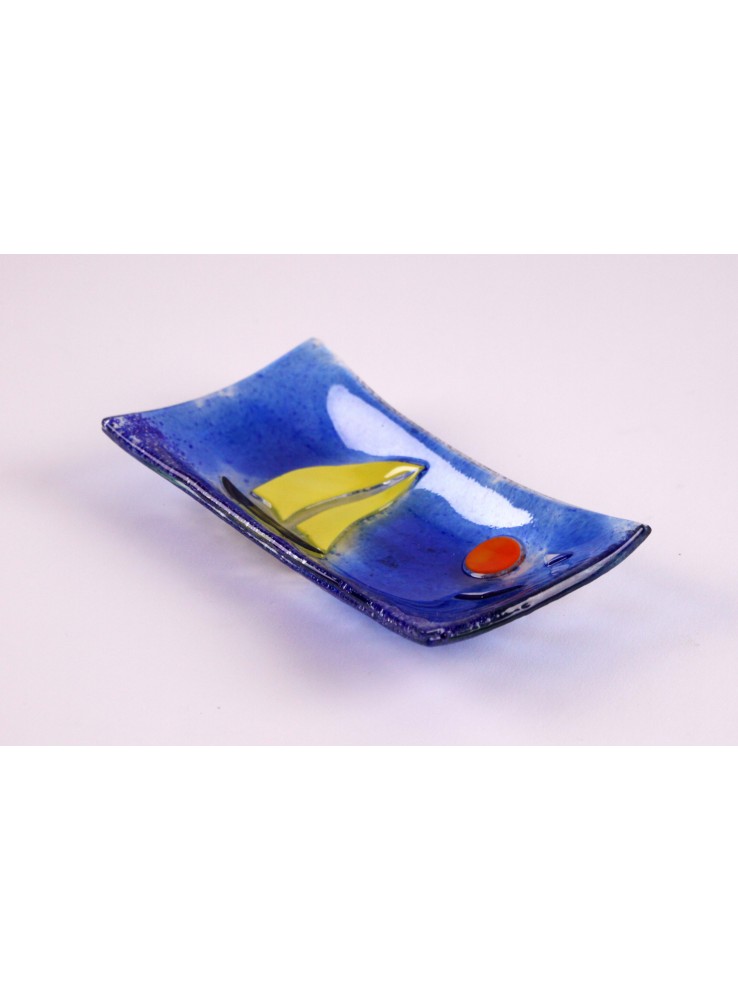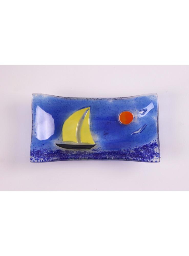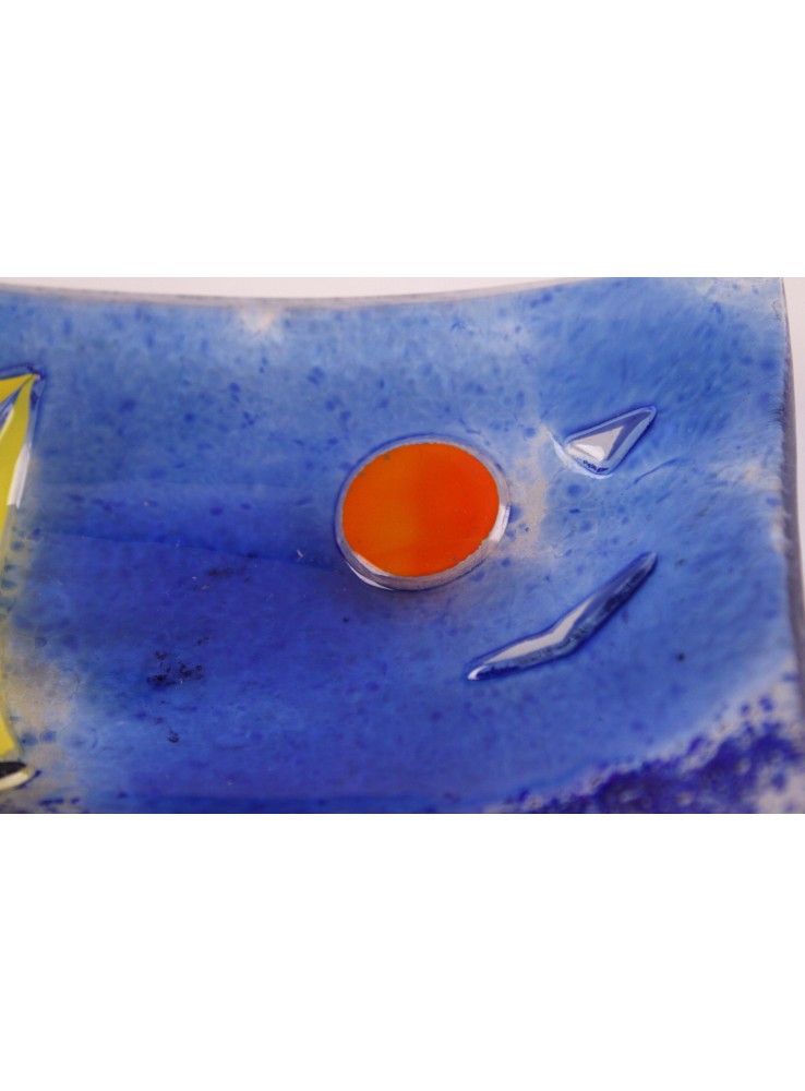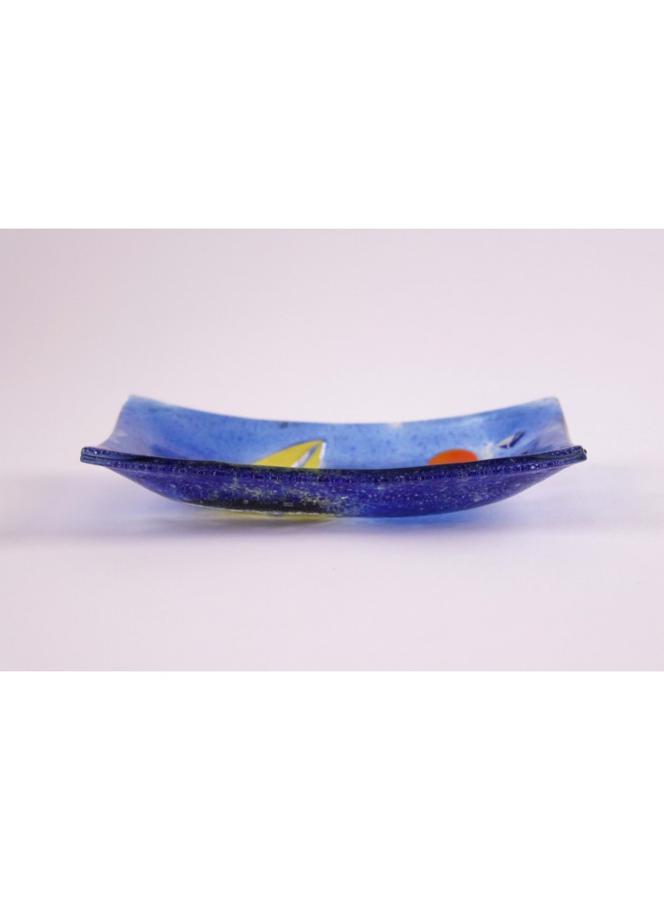 Vela 4: vassoio rettangolare ornamentale, decorato da paesaggio marino e realizzato in assemblaggio con vetri flosing.